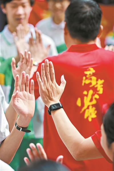 高考第一天,考生向家长老师击掌鼓劲后,自信地步入南武中学考场。广州日报全媒体记者苏俊杰 摄