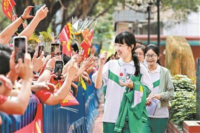 在广州天省实验学校,连廊被红色与金色装点,老师们高举向日葵步入连廊,高三学子们笑着、跑着冲向送考队伍,与老师们用力击掌。有的同学还兴奋地蹦起,伸手“摘取”老师手中的向日葵,现场欢呼声、“加油”声此起彼伏。“老师,等我凯旋!”“加油,你一定行!”一句句叮咛、一次次击掌,化作无形的力量鼓舞考生。他们眼神坚定、斗志昂扬,带着全校的祝福迈向考场。