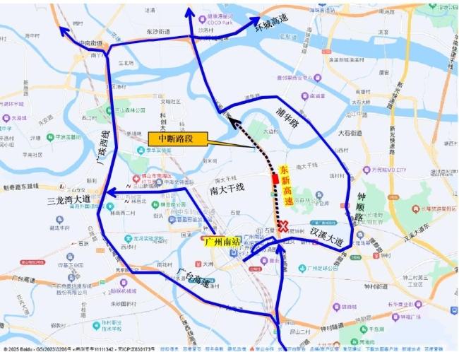 广州市中心区交通项目管理中心计划于2025年6月17日凌晨2:00—2:30临时全封闭中断广州南站出口路段北向交通,实施东新高速北行K9+600交通门架标志安装。具体绕行路线如下: