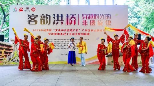 6月12日,在第20个“文化和自然遗产日”来临之际,越秀山畔,山歌飞扬。为进一步提高市民群众非遗保护意识,传承弘扬中华优秀传统文化,营造向上向善的文明新风尚,越秀区开展“客韵洪桥 穿越时光的非遗旋律”广州客家山歌文明实践展演主题活动。活动由越秀区精神文明建设办公室、越秀区文化广电旅游体育局指导,洪桥街道党工委、洪桥街道办事处主办,洪桥街道新时代文明实践所、洪桥街道文化站、越秀区文化馆、广州市越秀公园承办。