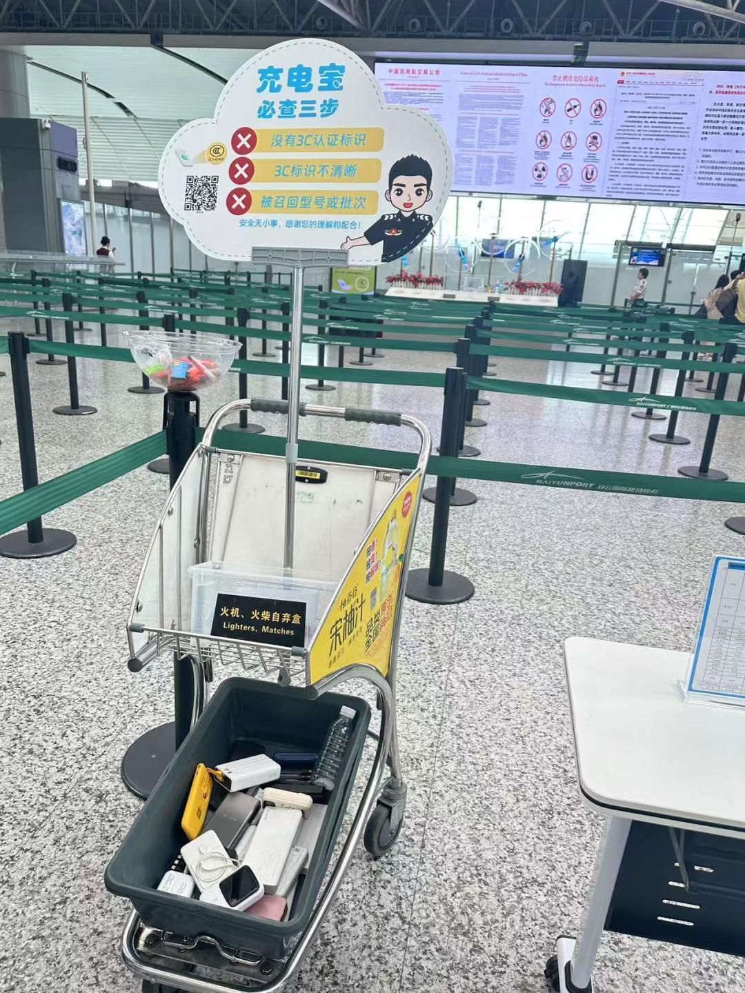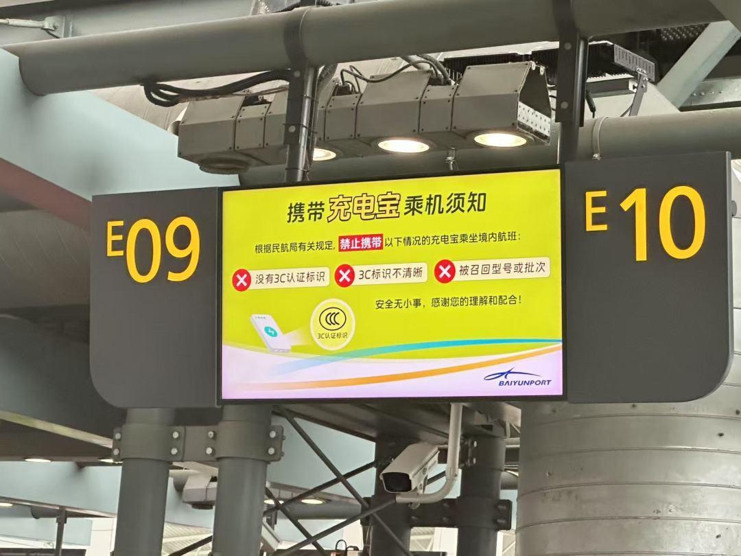 7月1日,广州日报新花城记者走访广州白云机场发现,机场地铁站出口、值机岛显示屏、人工柜台前、行李托运区、安检入口等多处有醒目告示:没有3C认证标识、3C标识不清晰、被召回型号或批次的充电宝,禁止携带乘坐境内航班。