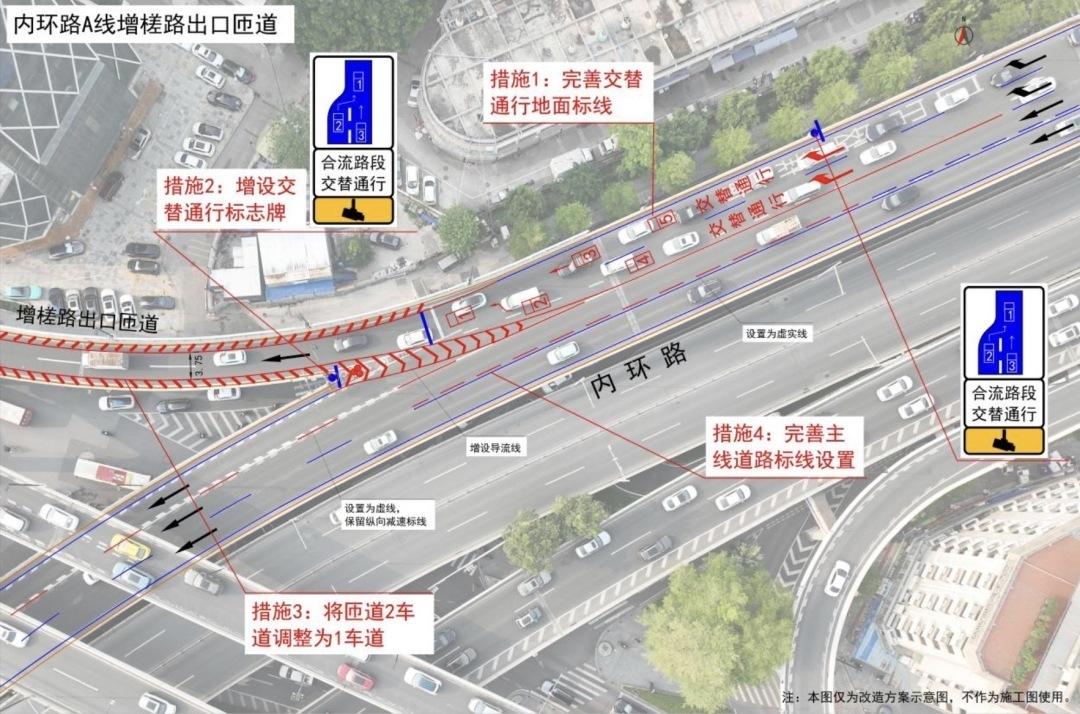 根据公告,具体措施包括:完善交替通行地面标线;增设交替通行标志牌;将匝道2车道调整为1车道;完善主线道路标线设置。记者留意到,今年6月,广州交警曾发布公告称对内环路B线人民高架出口匝道路段实施“交替通行”改造。