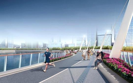 桥面将设置3米宽步行道与2米宽跑步道,搭配休憩座椅、绿化花池等,同时配备防滑铺装与护栏,也能保障老人、儿童出行安全,实现通行与休闲功能的巧妙结合。功能分区设计可满足不同群体需求,对于附近健身爱好者来说,建成后可成为沿江慢跑好去处。