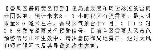 12时26分,番禺区气象台继续发布暴雨黄色预警信号,预计未来2-3小时番禺区有强雷雨,最大时雨量30毫米左右。