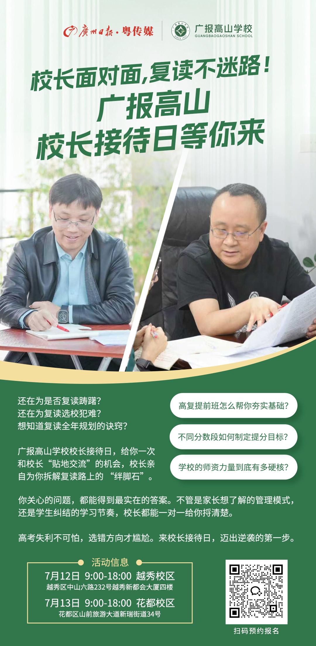 还在为是否复读踌躇?还在为复读选校犯难?想知道复读全年规划的诀窍?广报高山学校校长接待日,给你一次和校长 “贴地交流” 的机会,校长亲自为你拆解复读路上的 “绊脚石”: