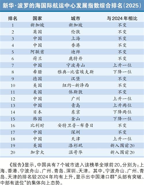 近日,《新华·波罗的海国际航运中心发展指数报告(2025)》(以下简称“《报告》”)对外发布。《报告》显示,广州超越东京位居全球第12位,与2024年位次(第13位)相比上升了1位,在中国区排名中仅次于上海、香港、宁波舟山,位居全国第4位,彰显出广州国际航运枢纽建设取得新成效,全球影响力和航运资源配置能力进一步提升。