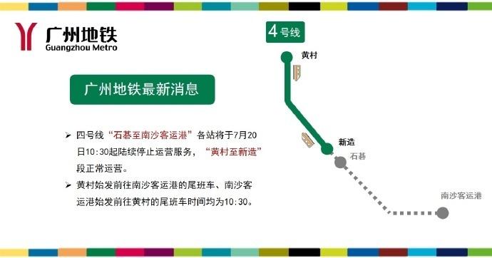 7月20日早上10时,广州地铁发布消息,受台风“韦帕”影响,为保障乘客出行安全,四号线“石碁至南沙客运港”各站将于7月20日10:30起陆续停止运营服务,即黄村始发前往南沙客运港的尾班车、南沙客运港始发前往黄村的尾班车时间均为10:30,“黄村至新造”段正常运营。
