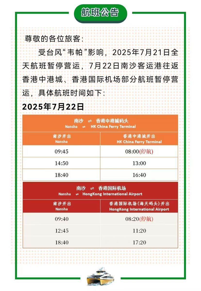 南沙客运港7月21日全天航班暂停营运,7月22日往返香港中港城、香港国际机场部分航班暂停营运。