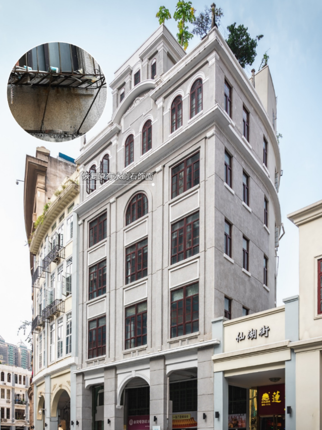 在泰康路北段,连绵的骑楼街沿着蜿蜒的马路伸展。设计团队根据历史影像资料和现状勘察情况,采取“一栋一策”微改造模式开展骑楼建筑保护修缮,通过精细化修复,保护建筑的原真性,让百年骑楼重拾挺拔轩昂的建筑美感,把街区变成开放式的岭南建筑博物馆。
