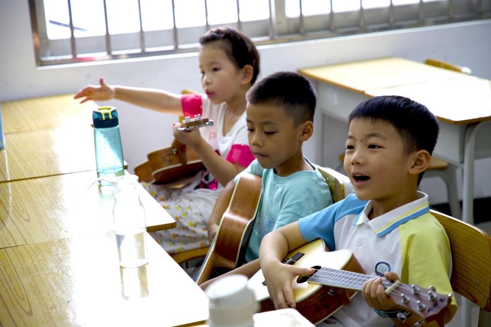 广州市工人文化宫的小朋友正在上尤克里里课。人民网 房于情摄