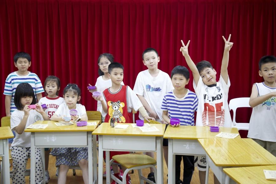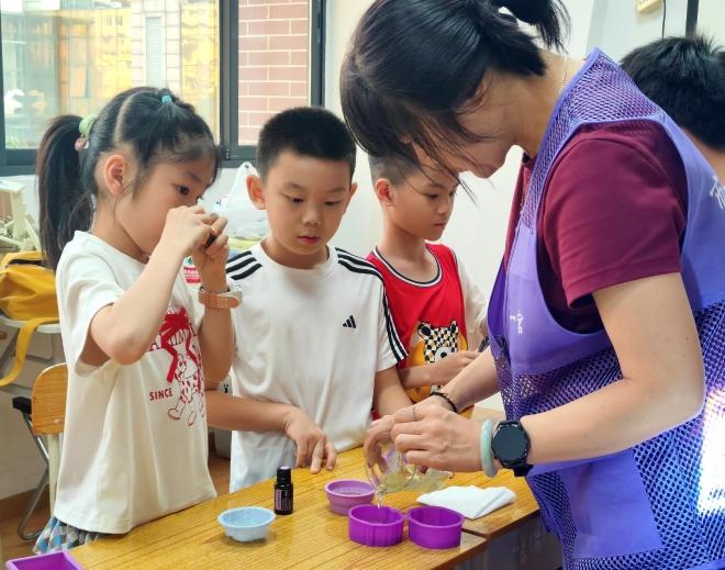 广州市工人文化宫的小朋友在老师的带领下制作手工皂。人民网 宁玉瑛摄
