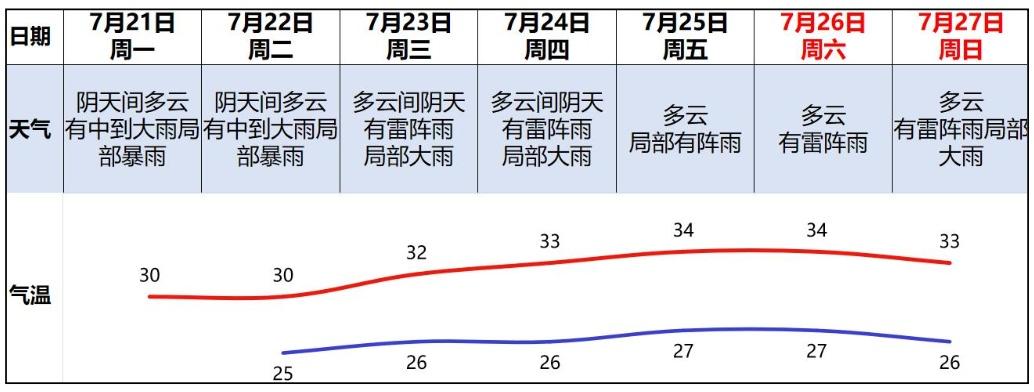 7月21日,广州市防汛防旱防风总指挥部办公室与市气象局、省水文局广州水文分局对广州的气象水文情况进行了会商。会商结论指出,预计,21日至22日,阴天间多云,受“韦帕”外围环流和偏南气流影响,有中到大雨局部暴雨;23日至24日,多云间阴天,受季风影响,仍有雷阵雨,局部雨势较大;25日至26日,多云为主,局部有阵雨,天气趋炎热;27日起,可能受热带系统外围环流影响,降水又趋明显,有雷阵雨局部大雨。
