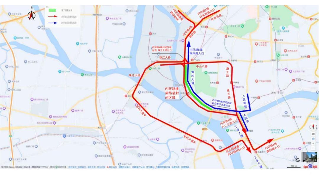 为加快推进如意坊放射线系统工程(一期)项目建设,广州市中心区交通项目管理中心计划于2025年7月26日0:00~06:00、7月27日0:00~06:00临时封闭内环路AB线中山八路至六二三路段,开展该项目钢箱梁吊装。请过往车辆根据交通管制和现场指示标志指引,合理安排绕行路线。具体绕行路线如下: