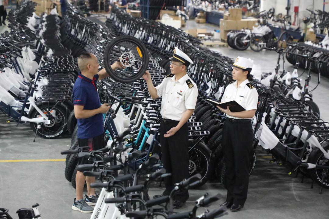 图说:广州海关所属花都海关关员调研电动自行车生产企业生产经营情况并宣讲海关惠企政策。
