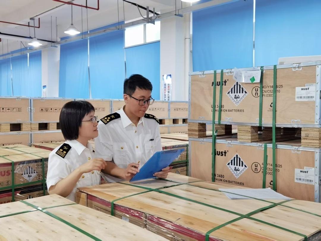 图说:广州海关关员对出口非洲的锂电池进行查验。