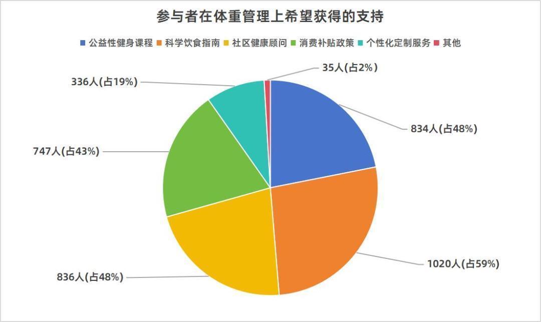 在体重管理服务需求方面,科学饮食指导是参与者最为迫切的需求,占比达59%;其次是公益性健身课程和社区健康顾问服务,均占48%;消费补贴政策支持则以43%的占比位列第三。这一需求分布反映出参与者对兼具专业性、便捷性和经济性的体重管理服务的普遍期待。