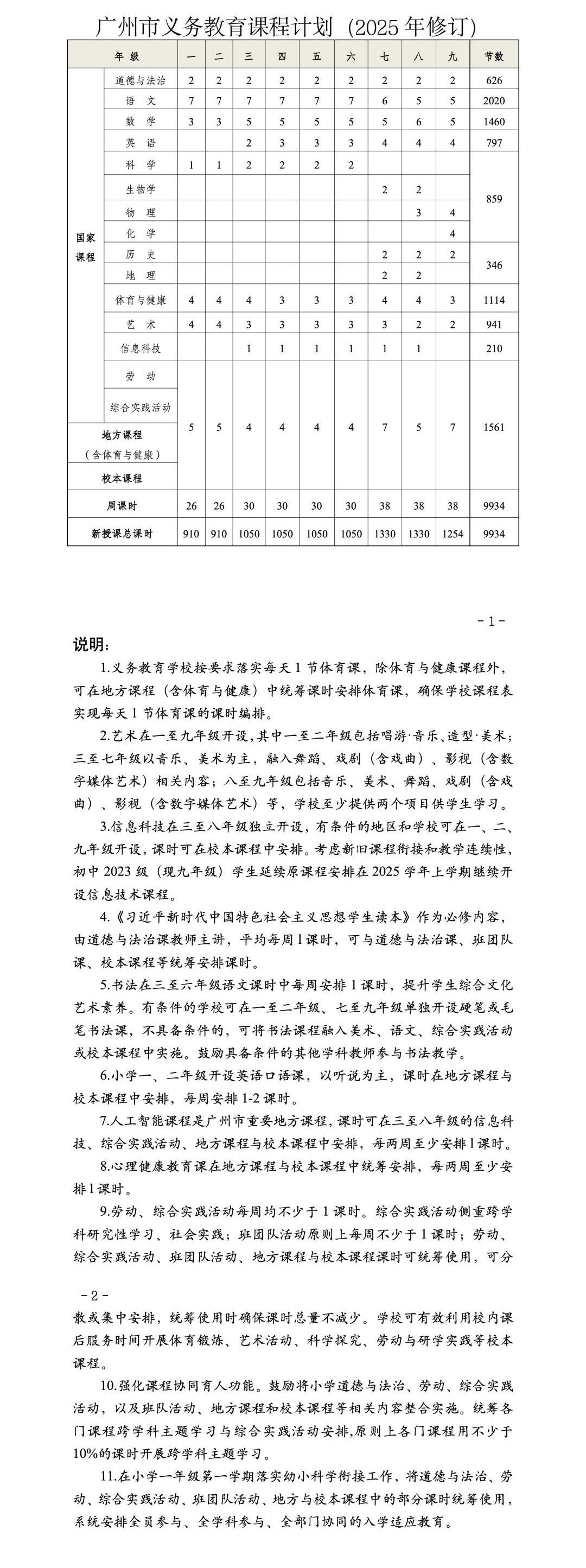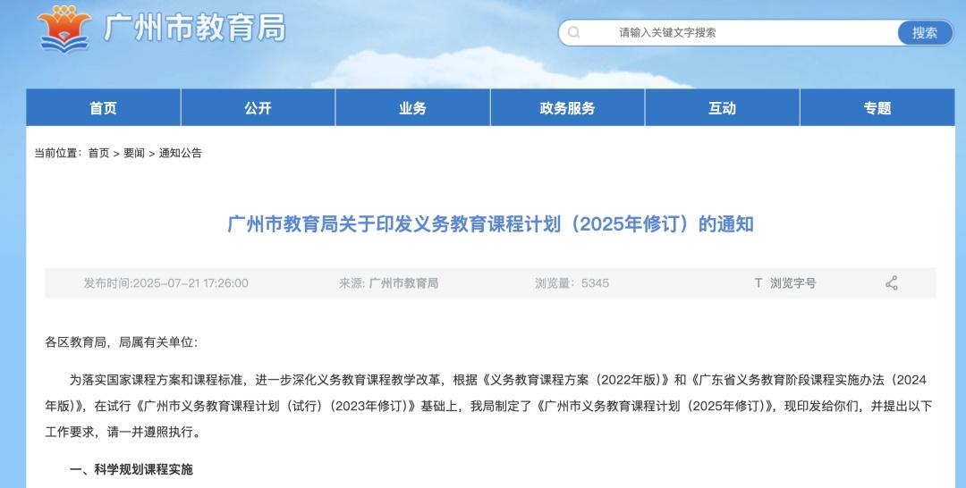 7月21日,广州市教育局官网发布关于印发义务教育课程计划(2025年修订)的通知,明确: