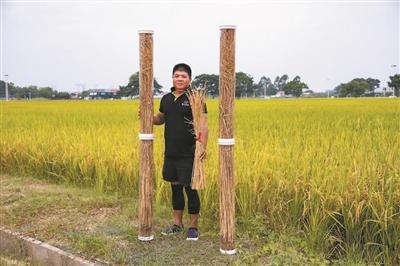 “这种巨型水稻结出的稻米是国标优质米,米饭柔软清香,煮粥口感更佳。巨型稻成熟时,籽黄叶绿,秸秆可用作牛、羊等畜牧养殖动物的高品质青贮饲料,具有较高的利用价值。”广东穗云农业科技有限公司总经理卿小珍介绍,根据研究团队的种植经验,该品种是水稻新成员,其穗大粒多,生物量高,高产潜力大,株高达1.8米—2米,亩产稻谷约1000公斤。