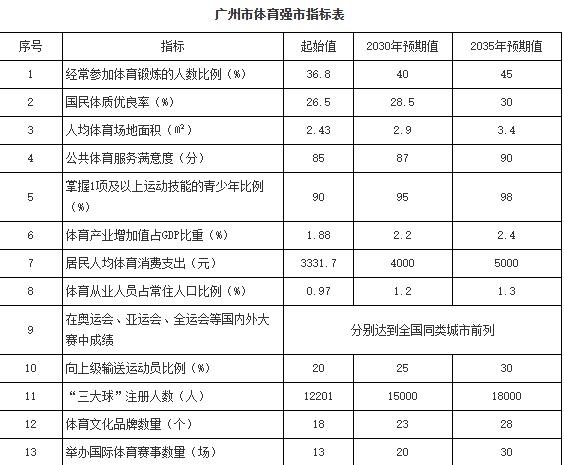 根据《规划》,到2030年,广州将基本建立更高水平的全民健身公共服务体系,经常参加体育锻炼人数比例达到40%以上,人均体育场地面积达到2.9平方米;体育产业增加值占GDP比重达到2.2%,培育形成1—2个千亿级体育产业集群;到2035年,全面实现公共体育服务标准化、均等化、智能化,人均体育场地面积达到3.4平方米,经常参加体育锻炼人数比例达到45%以上,体育产业增加值占GDP比重达到2.4%,培育一批具有全球竞争力的体育头部企业和体育产业集群。