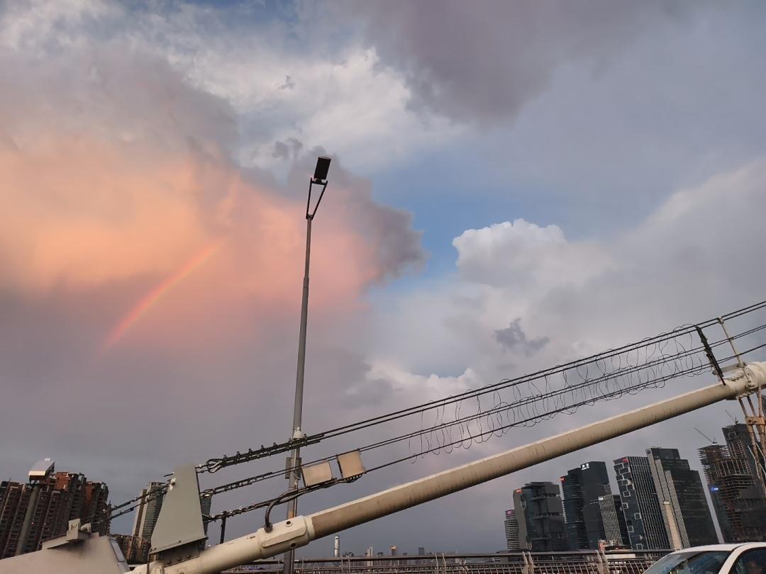 今日傍晚,雷阵雨过后,广州猎德大桥上出现了小段彩虹,不少市民纷纷拍照,享受雨后的浪漫。