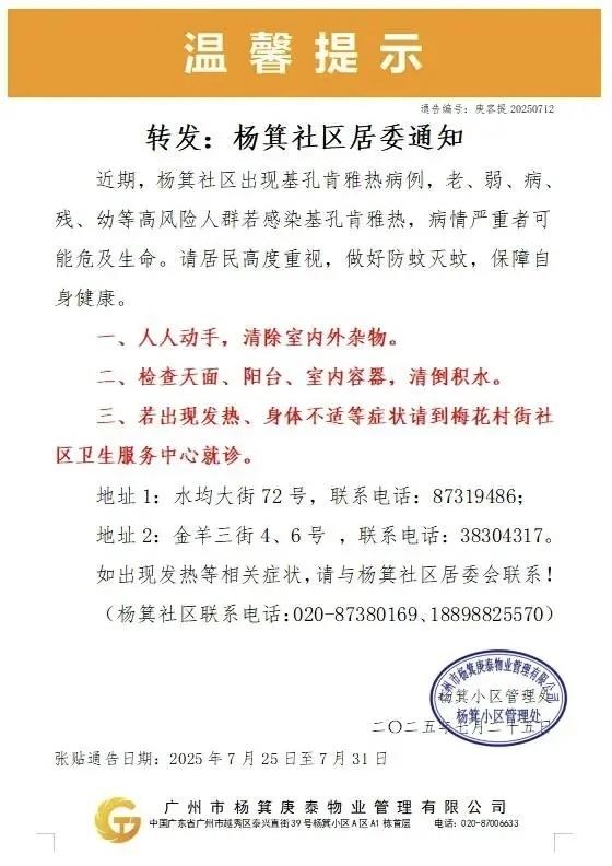 7月25日,广州市越秀区梅花村街杨箕社区有物业公司贴出告示,杨箕社区居委通知,该社区已出现基孔肯雅热病例,请居民高度重视,做好防蚊灭蚊,保障自身健康。
