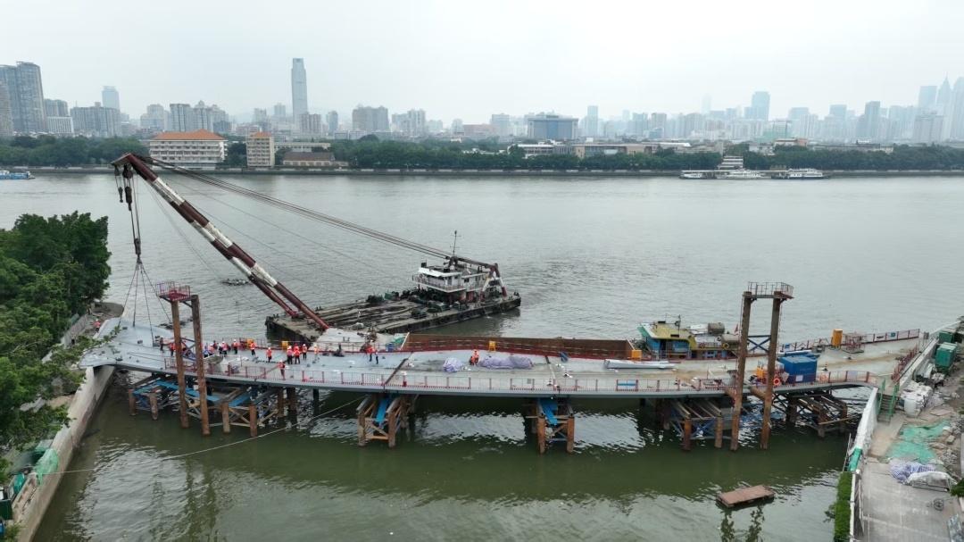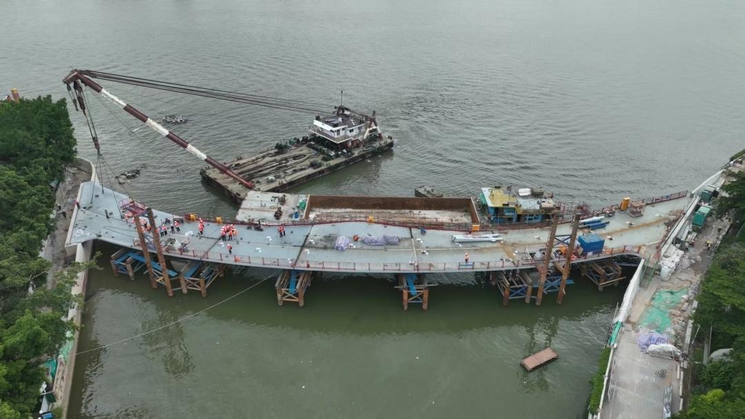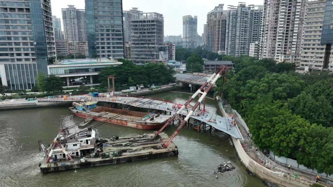 承建单位中建科工介绍,桥梁采用圆弧形的平面布置,在河湾处形成环抱式的聚拢空间,通过索桁架结构减小桥梁结构高度。人行桥由7节段拼装而成,采用200吨趴臂式浮吊船进行吊装,4日完成首吊,今天正式合龙。