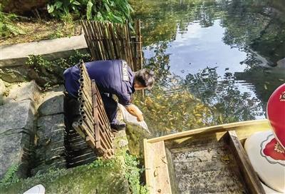 工作人员在广州兰圃园区水体投放食蚊鱼。通讯员供图