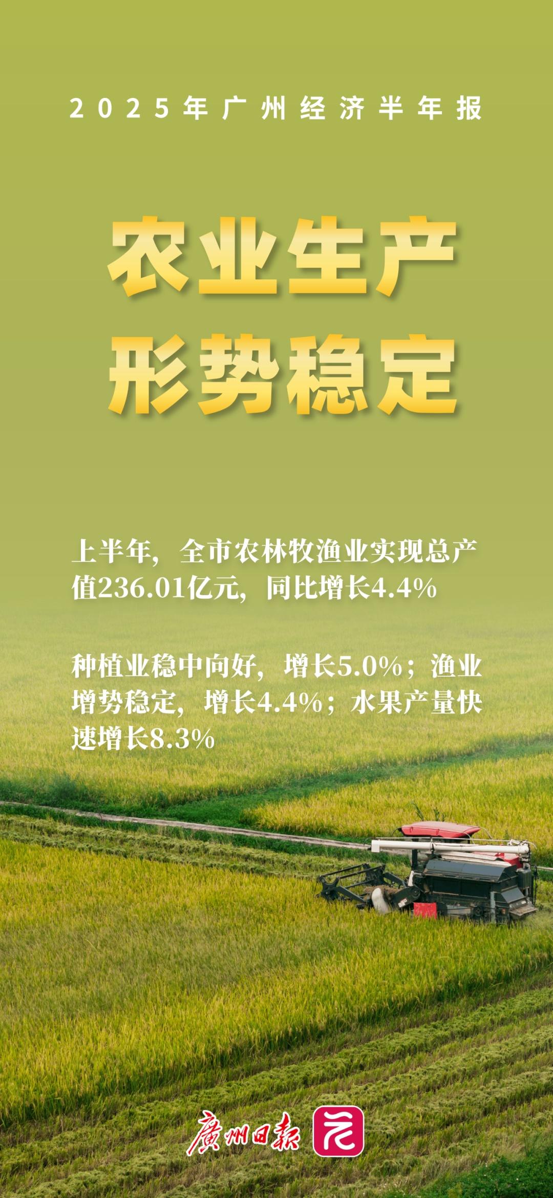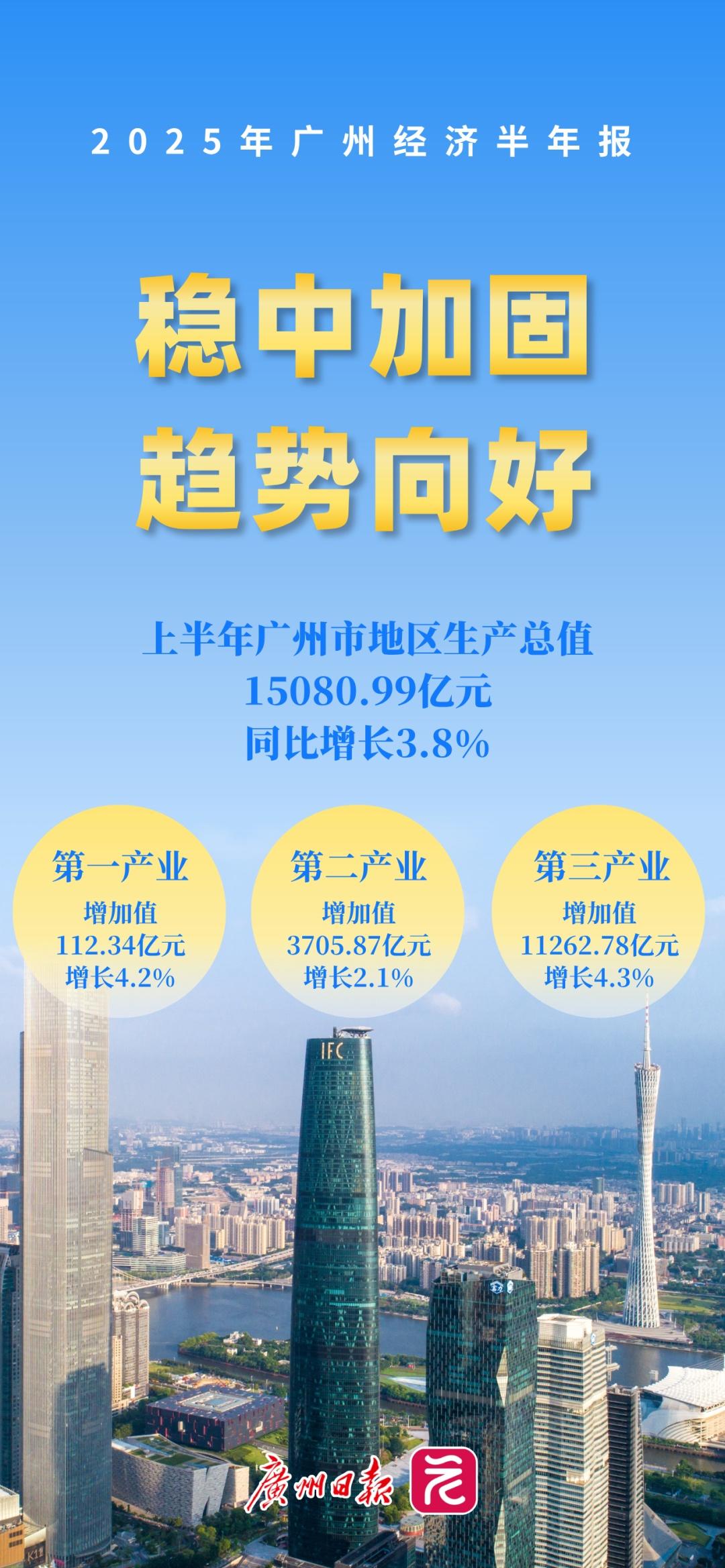数据显示,根据广东省地区生产总值统一核算结果,2025年上半年,广州市地区生产总值15080.99亿元,按不变价格计算,同比增长3.8%。