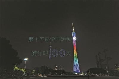 昨晚,无人机在海心沙上空写下“第十五届全国运动会倒计时100天”等字样和图案,为全运会预热。广州日报全媒体记者王维宣 摄
