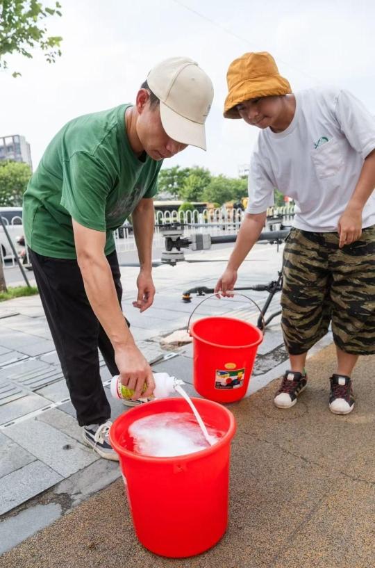 当日下午,记者来到白云大道北永泰牌坊,只听得永康北路的人行道上传来一阵嗡鸣。随着飞手轻轻按下启动键,一架搭载着智能喷洒系统的四旋翼无人机缓缓升空,沿着预设航线平稳巡航。机腹下的喷头将环保灭蚊药剂转化为绵密的药雾,均匀覆盖洒向人行道上的树木、草坪及周边绿化带。