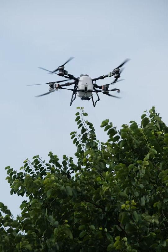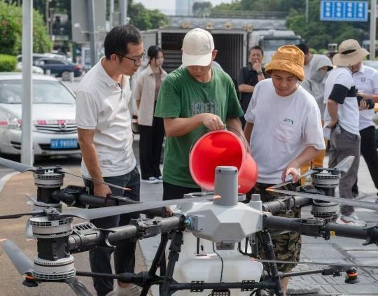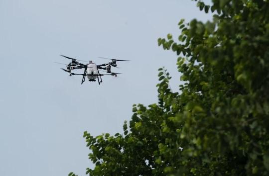 “我们使用大疆T100农业无人机,这次测试搭载了150斤杀蚊药剂,1分钟内最多可覆盖约500平方米范围,无人机的避让功能可以使它躲开空中的电线,安全航行。”广州元沣智能科技有限公司技术负责人表示,“园林、绿地等地方容易滋生蚊虫,而传统人工消杀效率低,操作不稳定,还容易遗漏隐蔽角落,无人机凭借灵活的低空飞行能力,能不受地形限制,可以实现高效全面的消杀防控。”