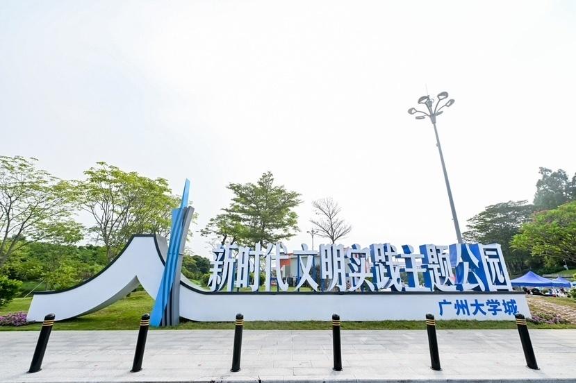 活动当天,广州大学城新时代文明实践主题公园揭牌,这是广州首个以新时代文明实践为核心的主题公园。公园坐落于番禺区小谷围岛核心区,沿中心湖铺展,以“一核两带三区”规划,串联14个景观点,“时代育人”“绿意动人”“以文化人”三大篇章层层递进,将生态绿岛化作文明课堂。