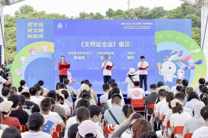 “迎接十五运会,我们每个人都是城市名片……”活动现场,多名代表共同发出《文明迎全运》倡议,呼吁更多的市民参与进来,一起支持全运会,共同宣传广州,为全运会注入文明动力。