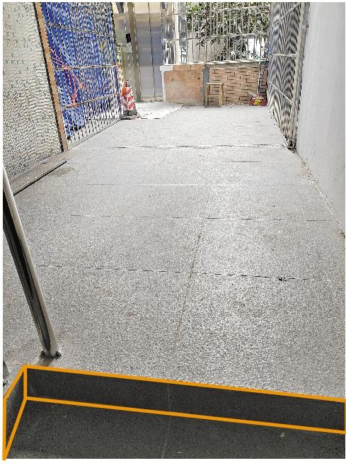 3楼电梯门出来后在公用平台上加盖了一条混凝土走道,整体厚度超过10厘米(如黄线所示)。
