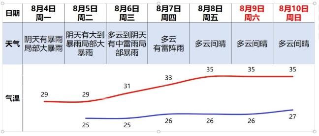 8月4日,市防汛防旱防风总指挥部办公室与市气象局、省水文局广州水文分局对我市的气象水文情况进行了会商。会商指出,预计,4日至5日,我市强降水持续,有暴雨局部大暴雨,后续累计雨量80~150毫米(局部200~280毫米),最大小时雨强60~80毫米,大暴雨落区主要在从化、增城区东部;6日,强降水范围缩小,北部局地强降水仍明显;7日起,副高增强,雨势减弱,天气又转炎热。