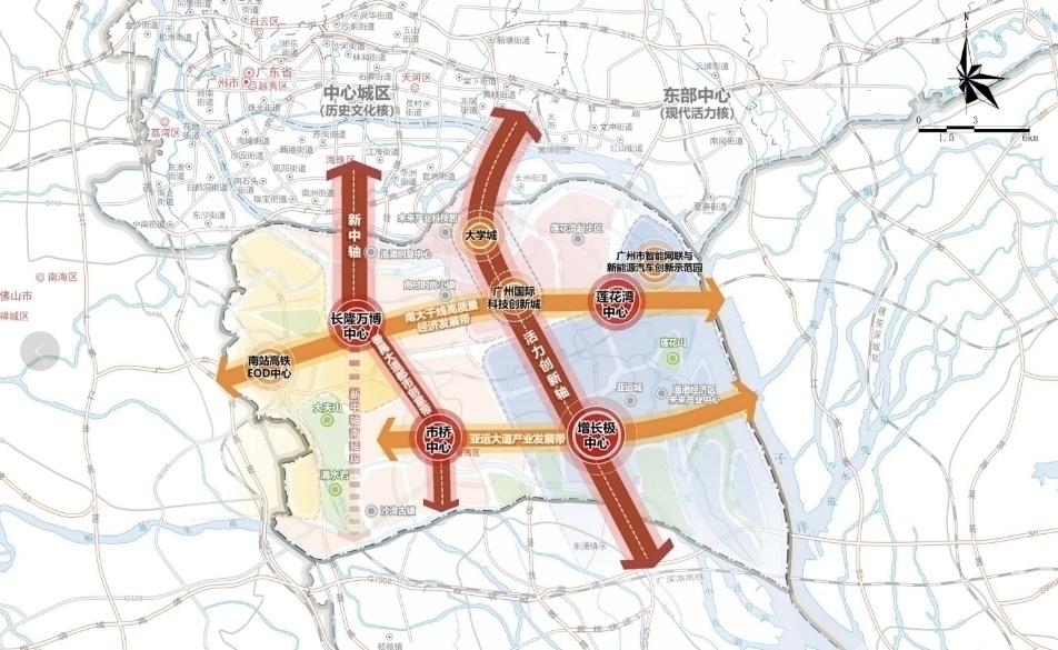 在城市空间发展上,番禺构建“两轴两带四中心”城镇空间格局。“两轴”为活力创新轴、新中轴;“两带”是南大干线高质量经济发展带、亚运大道产业发展带;“四中心”即增长极中心、市桥中心、长隆万博中心、莲花湾中心,以此推动区域一体化发展,优化城市功能结构。