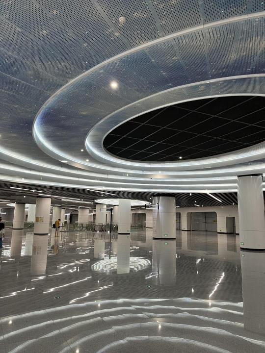 天河公园站为三线换乘车站,是广州地铁线网的重要交汇点,其中十一号线与二十一号线已开通运营。十三号线二期天河公园站全长约280米,标准段宽约34米,深约27米,为地下三层结构,沿用“浩瀚天际,天河星雨”的主题概念,打造兼具艺术性与功能性的地铁空间。在整体空间布局上,设计采用规整的几何形式,构建出以灰色为主的空间基调,并融入线性灯带,勾勒出光影线条。同时,以星空图案冲孔铝板为主题元素,搭配层叠错落的天花造型,与点状星光形成虚实映衬,营造出浩瀚星空的璀璨意境。