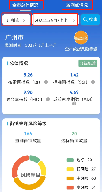“全市总体情况”中居民可搜索全市、不同区和街镇在不同监测周期内的蚊媒密度,了解蚊媒密度变化趋势。还针对不同的部门和个人提出针对性的蚊媒防制措施,为降低蚊媒密度提供指导。
