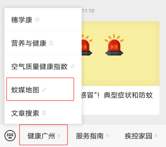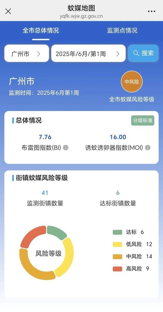 为方便市民查询蚊媒密度,进一步扩大蚊媒地图的受众,2024年5月30日,在广州疾控i健康公众号下拉菜单,健康广州-蚊媒地图可查询到广州市11个区近半个月的蚊媒密度情况,居民可搜索全市、不同区和街镇在不同监测周期内的蚊媒密度,了解蚊媒密度变化趋势。还针对不同的部门和个人提出针对性的蚊媒防制措施,为个人及基团单位共同参与降低蚊媒密度行动提供了指导。