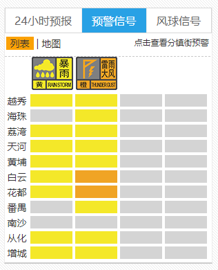 截至8月7日16:15,广州各区天气预警情况。