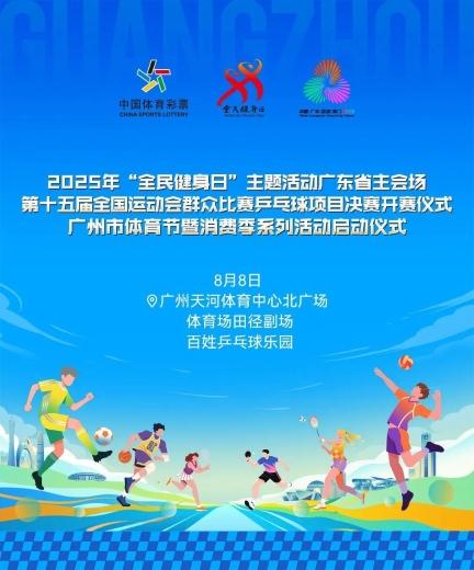 据介绍,8月8日,2025年“全民健身日”主题活动广东省主会场,第十五届全国运动会群众比赛乒乓球项目决赛开赛仪式,广州市体育节暨消费季系列活动启动仪式将在广州天河体育中心北广场聚力启航。
