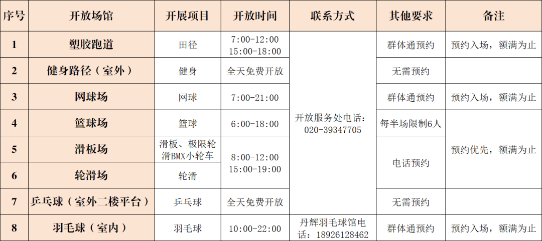 (二)电话预约:8月8日当天12:00—21:00时段的运动项目,市民朋友可在8月6日-8日工作期间,通过电话预约,咨询电话:020-38455111。