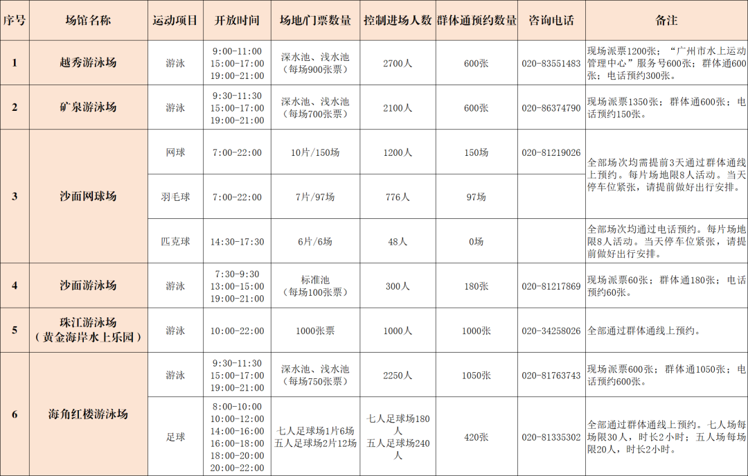 广州天河体育中心场馆及户外平面健身设施将免费开放,免费开放运动项目包括游泳、网球、棒球、垒球、门球、保龄球、乒乓球、桌球、气排球、羽毛球等,具体安排如下: