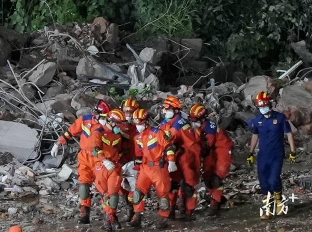 17时45分,救援人员用担架从现场抬出一名被困人员,并迅速送上救护车。据广州市白云区应急管理局消息,这名被困人员现场检查已无生命体征,经全力抢救无效死亡。