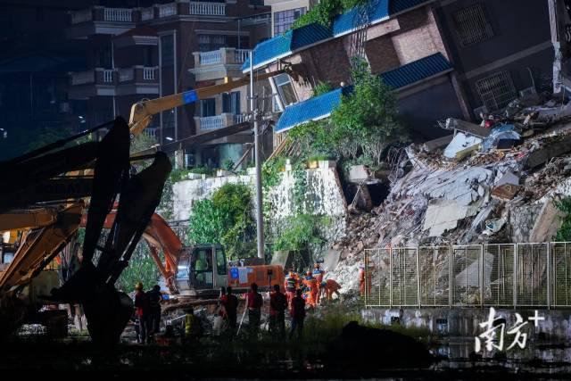 6日21时,救援工作仍在紧张进行,现场有挖掘机作业。