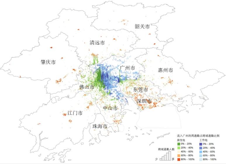 其中,广州与佛山、东莞等距离广州中心城区较近的邻穗城市,主要以日通勤为主,与珠海、江门、肇庆等非邻穗城市超80%为周通勤。
