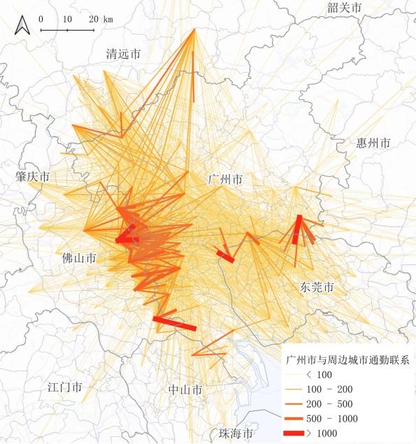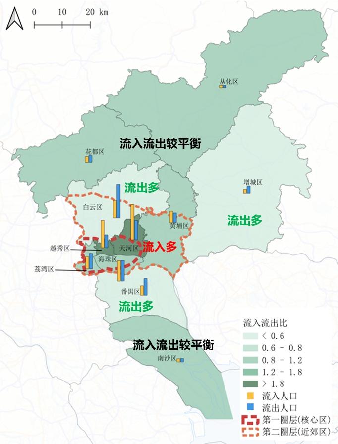 广州总体跨城通勤流入明显,与深、惠、清保持双向均衡