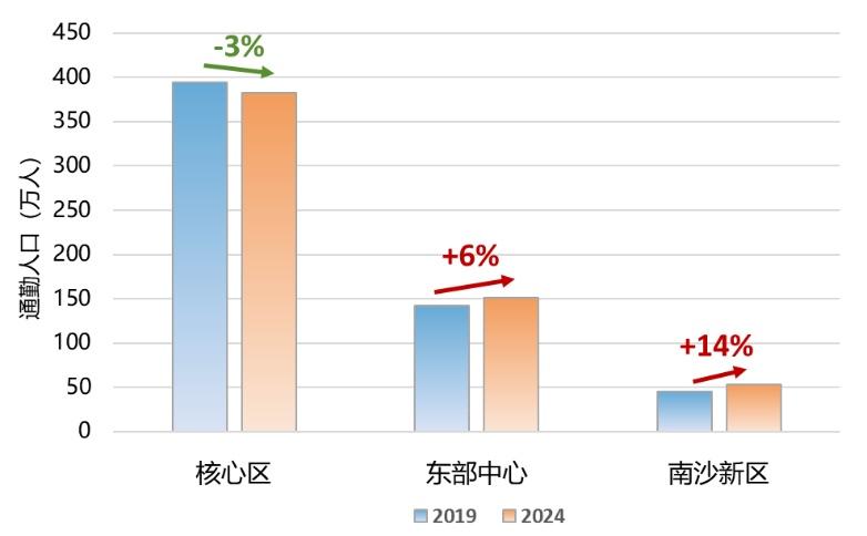 南沙新区、东部中心与核心区通勤人口能级的差距正在缩小,但绝对差距仍然较大,显示综合新城功能仍有待培育。