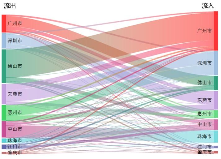 与深圳、惠州、清远间跨城通勤流入流出比为0.8-1.5,显示职住关系较为平衡。