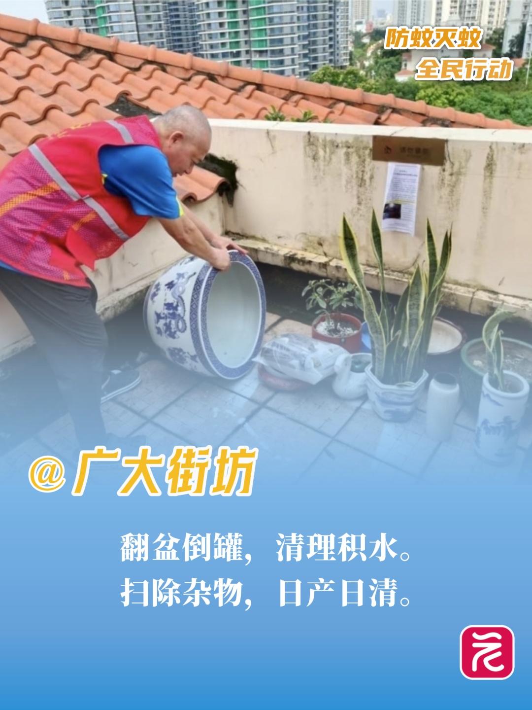 今天(8月9日)全天,广州在全市范围开展爱国卫生运动统一行动,做好环境卫生整治、翻盆倒罐清积水、清除蚊虫孳生环境等工作,确保全市全覆盖、无死角。